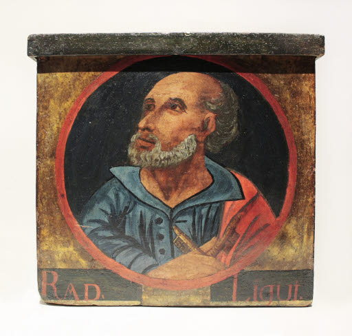 Inscripció: "RAD. Liqui." [Trifolium alpinum (arrels), regalèssia de muntanya], policromada, cara frontal, vora inferior.