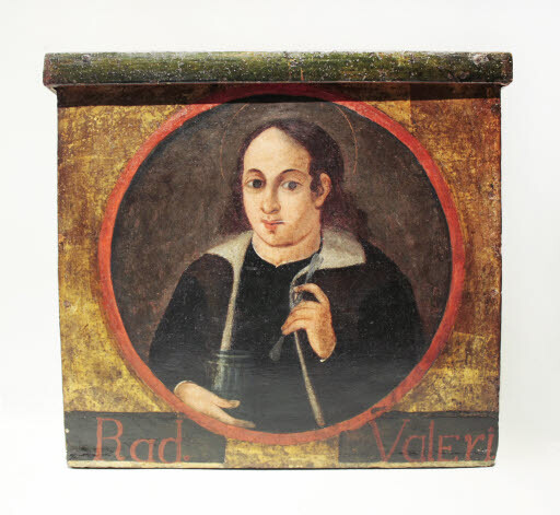 Caixa de fusta de cos paral·lelepipèdic, amb la base rectangular i tapa independent que tanca la part superior. Presenta la cara frontal daurada i policromada. Es representa un medalló delimitat per una franja de color vermell (tallat a la vora superior per la tapa), a l'interior apareix el bust de sant Cosme (probablement), sobre un fons neutre de color marró. Se'l representa amb aurèola al cap, sostenint amb la mà dreta un pot de farmàcia, i amb l'esquerra un instrument de cirurgia.