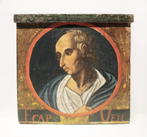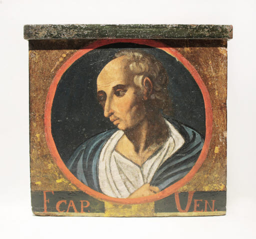 Caixa de fusta de cos paral·lelepipèdic, amb la base rectangular i tapa independent que tanca la part superior. Presenta la cara frontal daurada i policromada. Es representa un medalló delimitat per una franja de color vermell (tallat a la vora superior per la tapa), a l'interior apareix el bust d'un personatge masculí d'edat avançada, sobre un fons neutre de color blau fosc. Se'l representa amb túnica blanca i mantell blau.