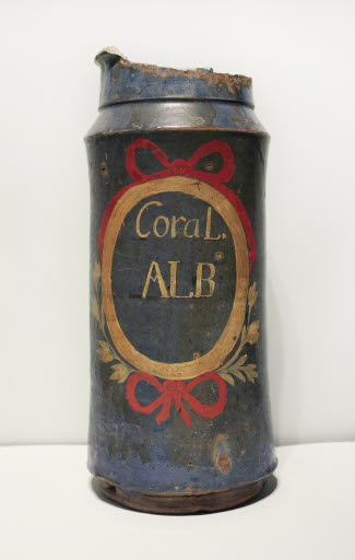 Tot i que aquest era el seu aspecte original, llis, cap a la segona meitat del segle XVIII es va decorar en fred amb pintura a l'oli ocre i vermella, seguint l'estètica dels anomenats "pots de Banyoles", que estaven de moda en aquell moment. Se li va afegir l'oval central, amb un llaç a la part superior i flanquejat per elements vegetals, estil Lluis XVI, i, a l'interior, el nom en llatí, abreujat, del producte que estava destinat a contenir.