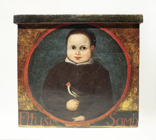 Caixa de fusta de cos paral·lelepipèdic, amb la base rectangular i tapa independent que tanca la part superior. Presenta la cara frontal daurada i policromada. Es representa un medalló delimitat per una franja de color vermell (tallat a la vora superior per la tapa), a l'interior apareix el bust d'un infant, sobre un fons neutre de color blau. Es tracta de l'infant Jesús, la cadernera que descansa sobre la seva mà dreta simbolitza la premonició de la passió i mort.