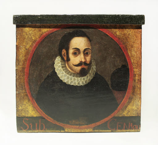 Caixa de fusta de cos paral·lelepipèdic, amb la base rectangular i tapa independent que tanca la part superior. Presenta la cara frontal daurada i policromada. Es representa un medalló delimitat per una franja de color vermell (tallat a la vora superior per la tapa), a l'interior apareix el bust d'un personatge masculí, sobre un fons neutre de color marró. Se'l representa amb bigoti, barba de boc i escarolat al coll. A la dreta de la figura es distingeix un objecte no determinat (podria ser un alambí).