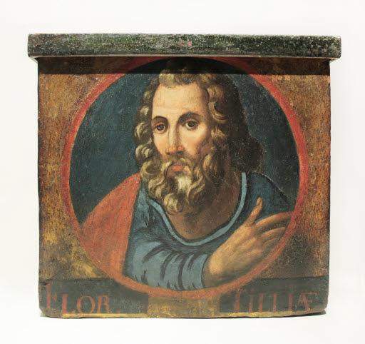 Caixa de fusta de cos paral·lelepipèdic, amb la base rectangular i tapa independent que tanca la part superior. Presenta la cara frontal daurada i policromada. Es representa un medalló delimitat per una franja de color vermell (tallat a la vora superior per la tapa), a l'interior apareix el bust d'un personatge masculí, sobre un fons neutre de color blau fosc. Se'l representa amb cabells llargs i barba, túnica blava i mantell vermell.