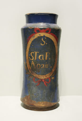 Pot de farmàcia tipus albarel. Es tracta d'un recipient de cos cilíndric, amb un lleu estrangulament central, espatlla i fons diferenciats per arestes, boca ampla, amb llavi, i repeu. És de ceràmica vidrada en blau cobalt per l'exterior i en blanc trencat per l'interior.