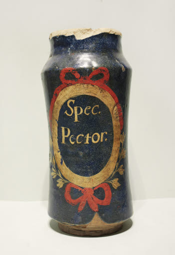 Pot de farmàcia tipus albarel. Es tracta d'un recipient de cos cilíndric, amb un lleu estrangulament central, espatlla i fons diferenciats per arestes, boca ampla, amb llavi, i repeu. És de ceràmica vidrada en blau cobalt per l'exterior i en blanc trencat per l'interior.