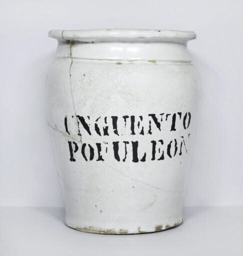 Inscripció: "UNGUENTO / POPULEON" [Unguentum populeon], cartel·la pintada amb trepa.