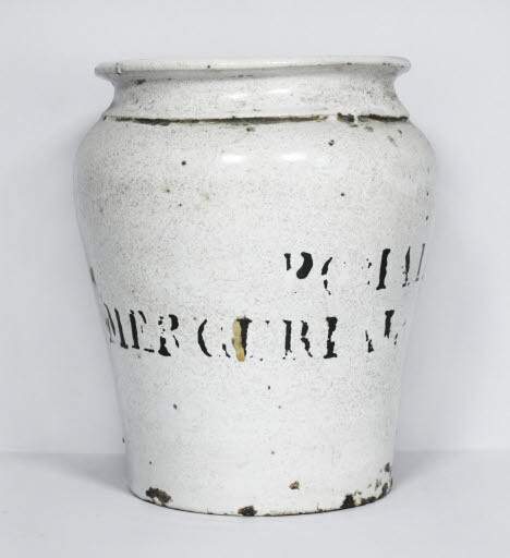 Gerra de cos troncocònic invertit, amb l'espatlla corbada, coll curt i diferenciat, boca molt ampla i vora exvasada amb llavi gruixut. Està vidrada en blanc i, a la part frontal, presenta una inscripció, feta a trepa amb pintura negra, referent al producte que estava destinada a contenir ungüent mercurial.