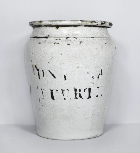 Gerra de cos troncocònic invertit, amb l'espatlla corbada, coll curt i diferenciat, boca molt ampla i vora exvasada amb llavi gruixut. Està vidrada en blanc i, a la part frontal, presenta una inscripció, feta a trepa amb pintura negra, referent al producte que estava destinada a contenir: untura (?); en aquest cas no s'ha pogut acabar de determinar quin element estava destinat a guardar.