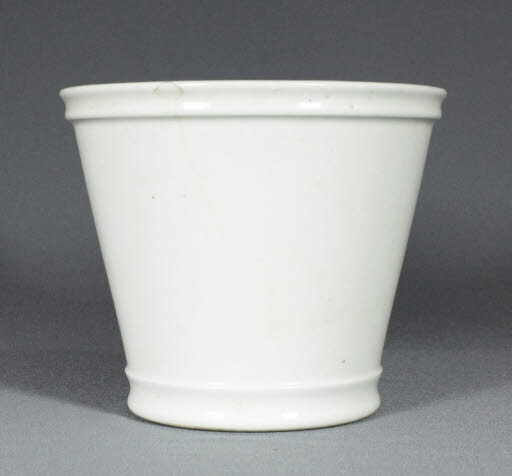 Morter de porcellana de cos troncocònic invertit, amb dues motllures decoratives simples, una prop de la vora superior, i l'altra prop de la base.