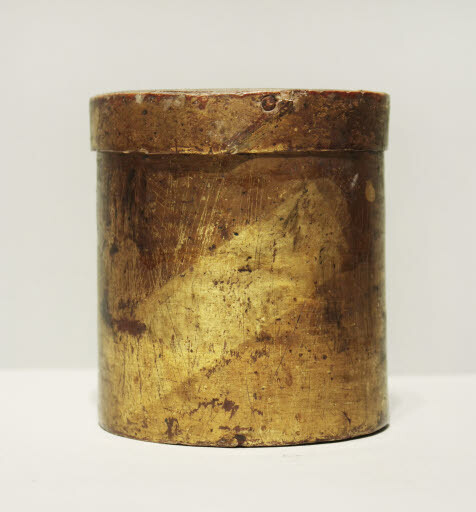 Pot cilíndric de fusta amb tapa. El cos del recipient està construït a partir d'una base circular de fusta gruixuda i d'una fullola prima cargolada i subjectada per puntes metàl·liques. La tapa està feta també amb un cercle de fusta envoltat per una franja de fullola. La fusta presenta una capa de preparació (probablement guix amb cola de conill), una capa de bol roig i, al damunt, el pa d'or (actualment molt deteriorat), recobert per un estrat de goma laca (actualment molt enfosquida).
