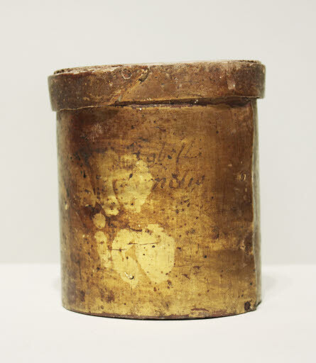 Pot cilíndric de fusta amb tapa. El cos del recipient està construït a partir d'una base circular de fusta gruixuda i d'una fullola prima cargolada i subjectada per puntes metàl·liques. La tapa està feta també amb un cercle de fusta envoltat per una franja de fullola. La fusta presenta una capa de preparació (probablement guix amb cola de conill), una capa de bol roig i, al damunt, el pa d'or (actualment molt deteriorat), recobert per un estrat de goma laca (actualment molt enfosquida).