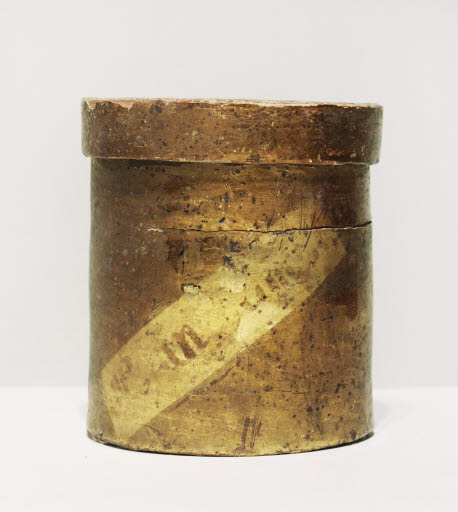 Pot cilíndric de fusta amb tapa. El cos del recipient està construït a partir d'una base circular de fusta gruixuda i d'una fullola prima cargolada i subjectada per puntes metàl·liques. La tapa està feta també amb un cercle de fusta envoltat per una franja de fullola. La fusta presenta una capa de preparació (probablement guix amb cola de conill), una capa de bol roig i, al damunt, el pa d'or (actualment molt deteriorat), recobert per un estrat de goma laca (actualment molt enfosquida).