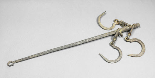 Braç llarg de secció quadrada, graduat i acabat amb un petit ganxo fixat en un extrem. De l'altre extrem pengen tres grans ganxos independents, que es subjecten a la peça mitjançant unions en forma d'U; aquestes unions amb perfil d'U van fixades en pivots mòbils que surten del mateix braç.