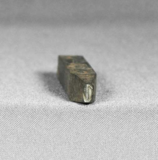 Estri en forma de tija de secció quadrada, la part superior presenta un cap pla i de secció igualment quadrada, mentre la part inferior té una secció afuada a l'extrem de la qual apareix la inscripció.