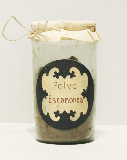 Inscripció etiqueta: "Polvo / Escamonea", manuscrita amb tinta.