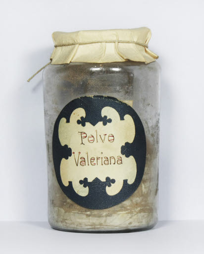 A la part frontal porta enganxada una doble etiqueta, formada per una làmina oval de vitel·la tenyida de color blau fosc verdós, i al damunt una làmina de paper de contorn sinuós, amb petites volutes i siluetes d'elements vegetals. Aquesta darrera està lleugerament acolorida i presenta una inscripció manuscrita amb tinta, referent al producte que el recipient estava destinat a contenir: pólvores de valeriana. Sota l'etiqueta esmentada se n'observa una altra, petita i allargada, enganxada per la part interior del pot. Sembla d'un moment anterior que l'anterior, i probablement es refereixi al contingut original del pot (actualment il·legible). La boca del recipient està coberta amb un fragment de pergamí lligat amb un cordill prim (no original). Aquesta era una de les maneres habituals de tapar els pots que contenien productes de farmàcia.
