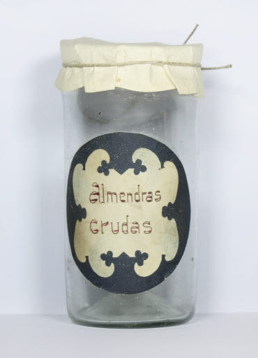 Inscripció etiqueta: "Almendras / crudas", manuscrita amb tinta.