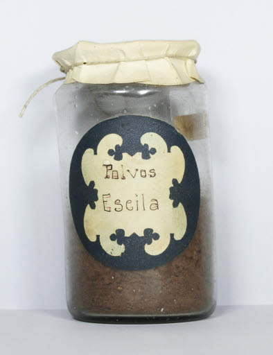 Potet de vidre més o menys cilíndric, de boca ampla i base cònica elevada. A la part frontal porta enganxada una doble etiqueta, formada per una làmina oval de vitel·la tenyida de color blau fosc verdós, i al damunt una làmina de paper de contorn sinuós, amb petites volutes i siluetes d'elements vegetals. Aquesta darrera està lleugerament acolorida i presenta una inscripció manuscrita amb tinta, referent al producte que el recipient estava destinat a contenir: pólvores d'escil·la. La boca del recipient està coberta amb un fragment de pergamí lligat amb un cordill prim (no original). Aquesta era una de les maneres habituals de tapar els pots que contenien productes de farmàcia.