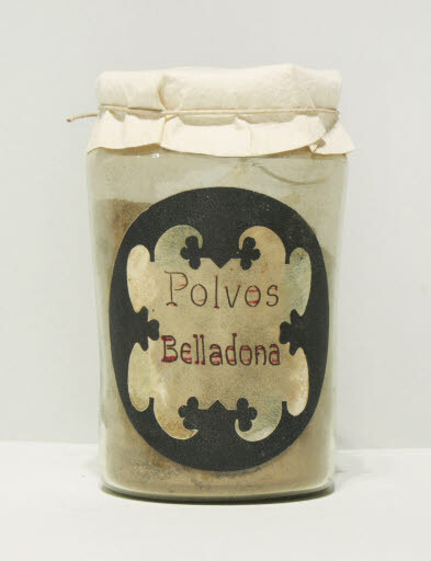 Inscripció etiqueta: "Polvos / Belladona", manuscrita amb tinta.