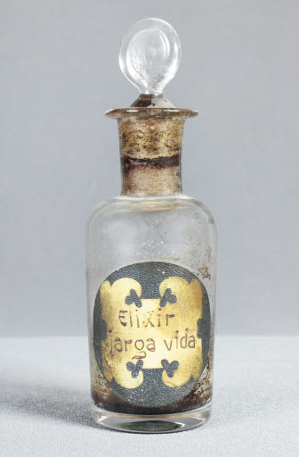 Inscripció etiqueta: "Elixir / larga vida" [Elixir longae vitae, elixir de llarga vida], manuscrita amb tinta.