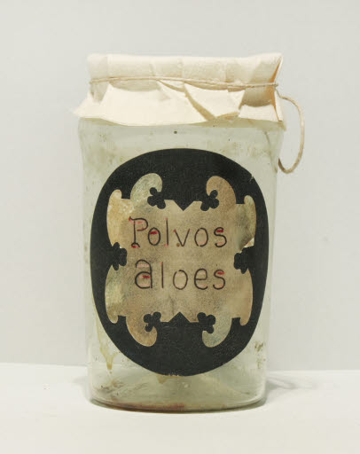 Inscripció etiqueta: "Polvos / Aloes", manuscrita amb tinta.