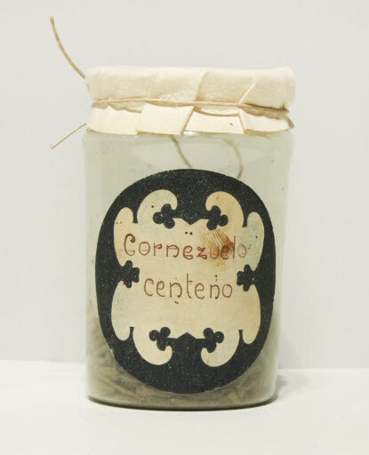 Inscripció etiqueta: "Cornezuelo / centeno", manuscrita amb tinta.