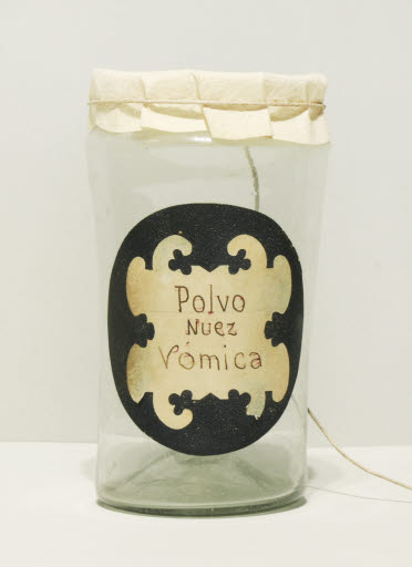 Inscripció etiqueta: "Polvo / Nuez / Vómica", manuscrita amb tinta.