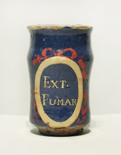 Pot de farmàcia tipus albarel. Es tracta d'un recipient de cos cilíndric, amb un lleu estrangulament central, espatlla i fons diferenciats per arestes, boca ampla, amb llavi, i repeu. És de ceràmica vidrada en blau cobalt per l'exterior i en blanc trencat per l'interior.