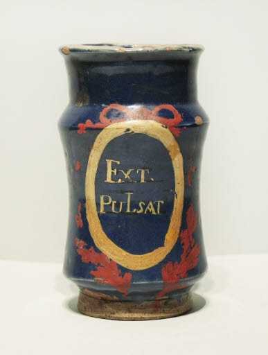 Tot i que aquest era el seu aspecte original, llis, cap a la segona meitat del segle XVIII es va decorar en fred amb pintura a l'oli ocre i vermella, seguint l'estètica dels anomenats "pots de Banyoles", que estaven de moda en aquell moment. Se li va afegir l'oval central, amb un llaç a la part superior i flanquejat per elements vegetals, estil Lluis XVI, i, a l'interior, el nom en llatí, abreujat, del producte que estava destinat a contenir: extracte de pulsatil·la.