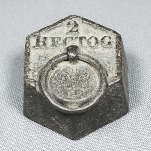 Pes de forma troncopiramidal, amb la base hexagonal. Presenta una anella circular abatible, subjectada al centre de la cara superior, que un cop plegada encaixa en un rebaix, de manera que no sobresurt apenes del pla horitzontal superior. Presenta una inscripció en relleu que n'indica en pes.