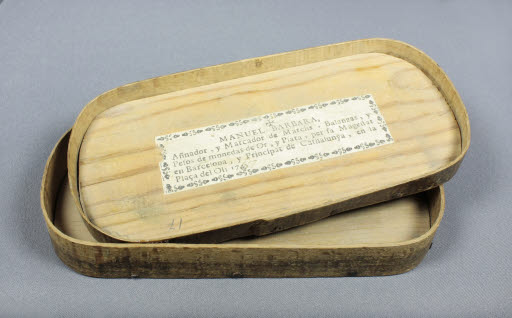 Inscripció etiqueta: "MANUEL BARBARA, / Afinador, y Marcador de Marchs, Balanzas, y / Pesos de monedas de Or, y Plata, per sa Majestat / en Barcelona, y Principat de Cathalunya, en la / Plaça del Oli 17[67]", estampada, les dues darreres xifres afegides a mà, enganxada sota la tapa de l'estoig.