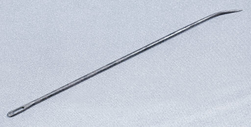 Agulla utlitzada possiblement per fer sutures. Tija de secció circular. En un extrem es corba lleugerament, passant a tenir secció romboïdal i acabant en punta molt afuada, punxant. A l'altre extrem presenta un orifici ovalat, per on passaria el cordill.