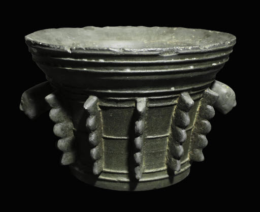 Morter d'estil gòtic amb el cos de forma troncocònica invertida, decorat amb motllures senzilles, concentrades especialment a la vora superior, i base plana. Presenta deu costelles dentades i dos agafadors, diametralment oposats, en forma de cap humà.