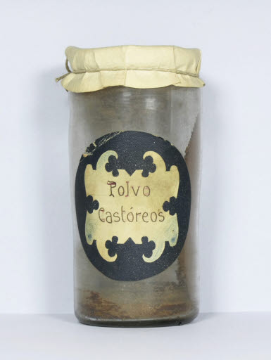 Inscripció etiqueta: "Polvo / Castóreos", manuscrita amb tinta.