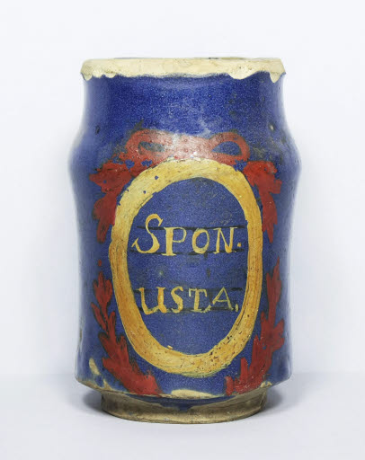 Tot i que aquest era el seu aspecte original, llis, cap a la segona meitat del segle XVIII es va decorar en fred amb pintura a l'oli ocre i vermella, seguint l'estètica dels anomenats "pots de Banyoles", que estaven de moda en aquell moment. Se li va afegir l'oval central, amb un llaç a la part superior i flanquejat per elements vegetals, estil Lluis XVI, i, a l'interior, el nom en llatí, abreujat, del producte que estava destinat a contenir: esponja cremada, esponja calcinada o carbó d’esponja.