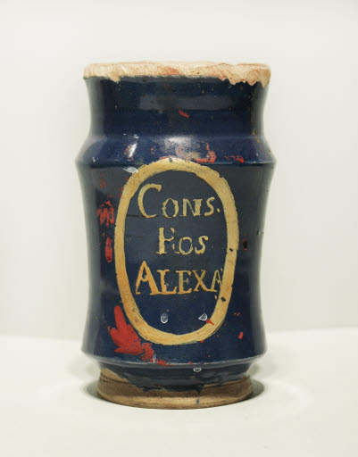 Pot de farmàcia tipus albarel. Es tracta d'un recipient de cos cilíndric, amb un lleu estrangulament central, espatlla i fons diferenciats per arestes, boca ampla, amb llavi, i repeu. És de ceràmica vidrada en blau cobalt per l'exterior i en blanc trencat per l'interior.
