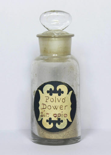 Inscripció etiqueta: "Polvo / Dower / sin opio", manuscrita amb tinta.