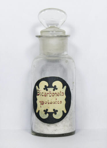 Inscripció etiqueta: "Bicarbonato / potásico", manuscrita amb tinta.