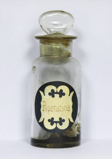 Inscripció etiqueta: "Piperazina", manuscrita amb tinta.