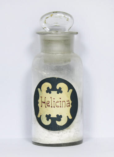 A la part frontal porta enganxada una doble etiqueta, formada per una làmina oval de vitel·la tenyida de color blau fosc verdós, i al damunt una làmina de paper de contorn sinuós, amb petites volutes i siluetes d'elements vegetals. Aquesta darrera està lleugerament acolorida i presenta una inscripció manuscrita amb tinta, referent al producte que el recipient estava destinat a contenir: helicina.