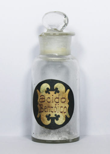 L’àcid benzoic és el més simple dels àcids carboxílics aromàtics i es presenta en forma de sòlid cristal·lí sense olor. Es recomanava guardar-lo en flascons de color topazi, doncs s’enfosquia amb l’exposició a la llum. Cal diferenciar l’àcid benzoic obtingut de la resina benzoica, exsudació de l’escorça del benjuí (Styrax benzoin), de l’àcid benzoic sintètic, que s’aconsegueix per oxidació parcial del toluè amb oxigen. El 1875 Salkowski descobrí les seves propietats antifúngiques, que el fan indicat en el peu d’atleta. També és antisèptic, antipútrid (les seves sals es fan servir per conservar aliments), expectorant i estimulant (estava indicat en les afeccions pulmonars). S’utilitzava en solució aquosa bullint per a la desinfecció de l’instrumental de cirurgia.