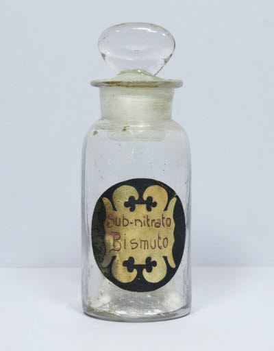 A la part frontal porta enganxada una doble etiqueta, formada per una làmina oval de vitel·la tenyida de color blau fosc verdós, i al damunt una làmina de paper de contorn sinuós, amb petites volutes i siluetes d'elements vegetals. Aquesta darrera està lleugerament acolorida i presenta una inscripció manuscrita amb tinta, referent al producte que el recipient estava destinat a contenir: subnitrat de bismut o nitrat bàsic de bismut.