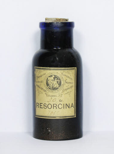 La solució de resorcina, inicialment incolora, es va enfosquint progressivament, per oxidació, amb la seva exposició a la llum, per la qual cosa es guardava en flascons de vidre acolorit, com en el cas que ens ocupa.