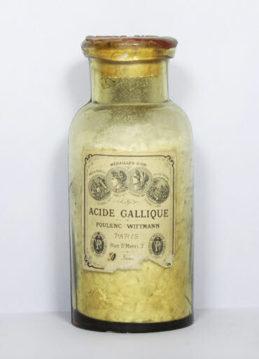 Inscripció etiqueta: "MÉDAILLES D'OR / [...] / ACIDE GALLIQUE / POULENC-WITTMANN / PARIS / Rue St Merri, 7 / 30 Gram[mes] / FABRIQUE DE PRODUITS CHIMIQUES PARIS / PW", estampada i manuscrita.