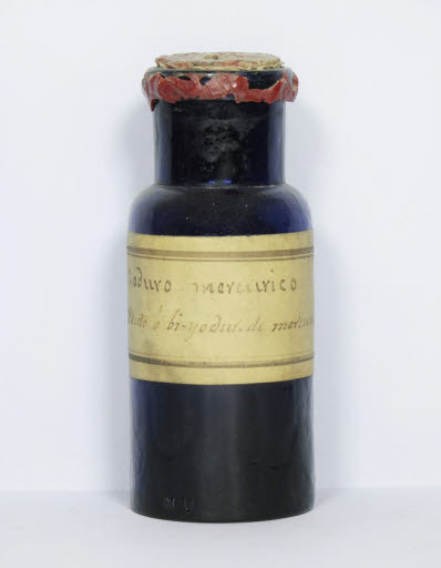 Porta una etiqueta de paper amb una inscripció referent al producte que el recipient estava destinat a contenir: iodur mercúric, deutoiodur de mercuri, biiodur de mecuri o iodur vermell de mercuri.