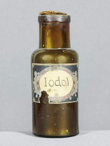 A la part frontal porta enganxada una etiqueta rectangular, estampada en vermell, verd, negre i daurat. Aquesta, de gust classicitzant, mostra un oval central, flanquejat per dues figures femenines alades de perfil, tipus mascarons, i amb un bust masculí barbat, en posició frontal, a la part inferior. A l'interior de l'oval hi consta el nom del producte que el recipient estava destinat a contenir: "Iodol".