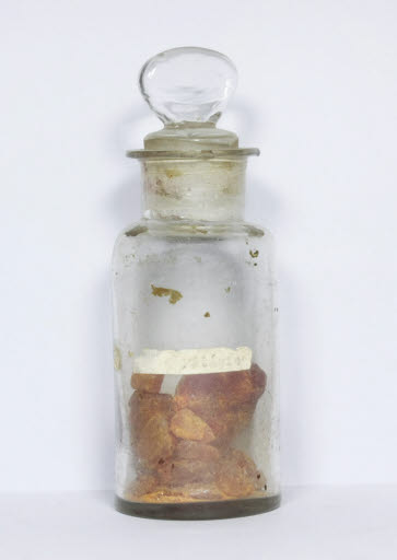 Presenta una etiqueta amb una inscripció referent al producte que estava destinat a contenir (avui parcialment llegible): alguna fórmula que contenia potasi.