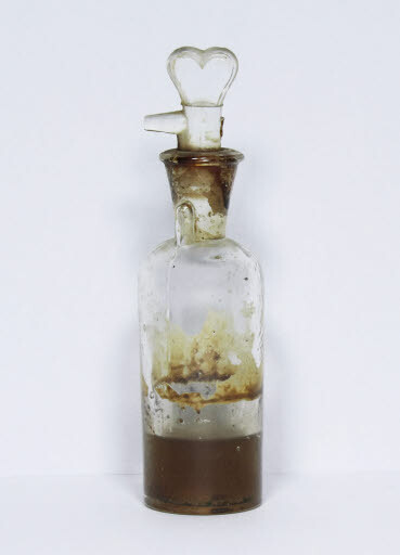 Flascó comptagotes de vidre incolor, amb el cos més o menys cilíndric, l'espatlla corbada, coll troncocònic invertit, i tap esmerilat amb broc dosificador i agafador de pastilla en forma de cor.