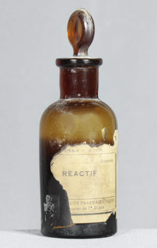 Inscripció etiqueta: "[...]OMAS-AGEN / [...] Grammes / RÉACTIF / [...] / [...] PRODUITS PHARMACEUTIQUES / [...]macien de 1re Classe", impresa i manuscrita.