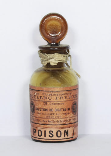 Inscripció etiqueta: "LES ÉTABLISSEMENTS / POULENC FRÈRES / 30 Grammes / SOLUTION DE DIGITALINE / CRISTALLISÉE AU 1 / 1000e / CODEX 1908 / FABRIQUE DE PRODUITS CHIMIQUES PARIS / PW / DEPOSEE / SIÈGE SOCIAL. Rue Vieille-du-Temple, 92, PARIS / POISON / Mod. J & B., Paris", impresa.